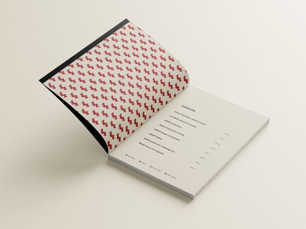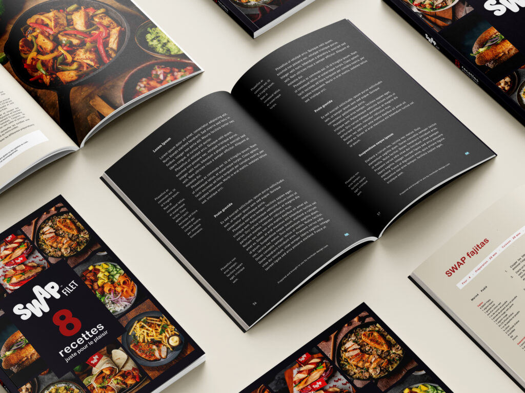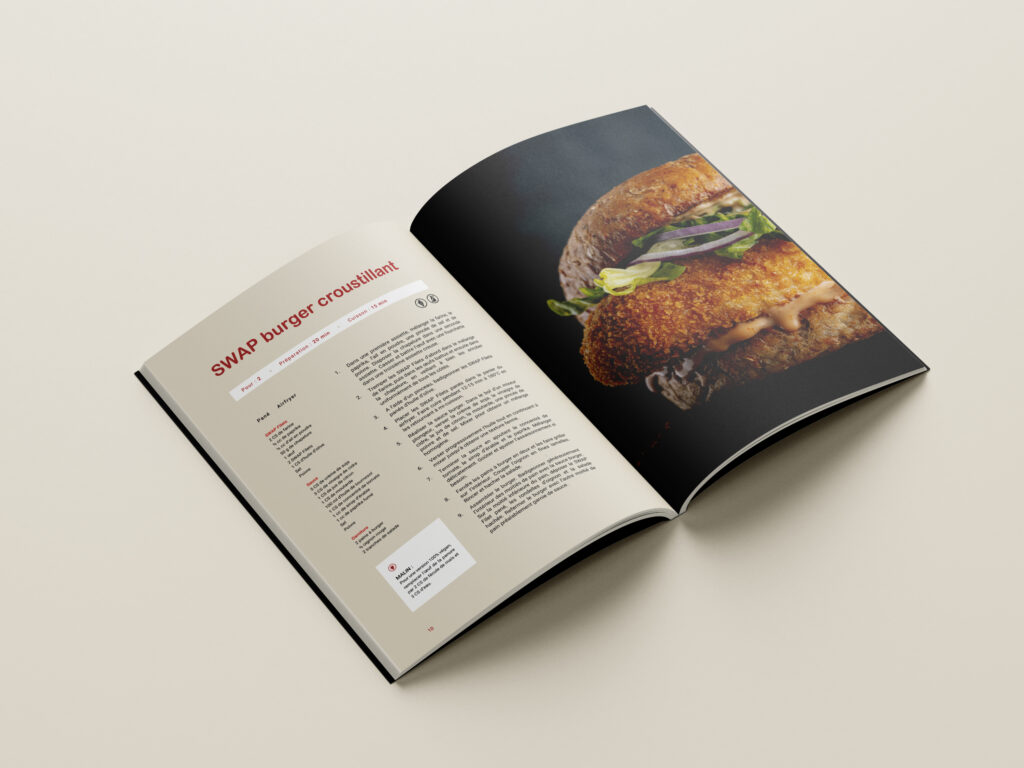 Dans le cadre du rebranding de la marque Swap Food (ex Umiami), nous avons réalisé le design éditorial d’un livre de recettes, en cohérence avec la nouvelle charte visuelle de la marque. Le design moderne, épuré et coloré met en avant le nouveau filet végétal de la marque : Swap Filet et a été pensé pour susciter la gourmandise et l’envie culinaire à travers chaque recette.